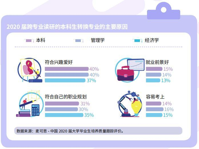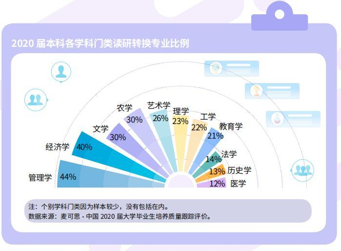 麦可思研究院《2021年中国本科生就业报告》显示,2020届本科毕业生读研转换专业的比例为26%,其中,管理学、经济学读研转换专业的比例分别为44%、40%。也就是说,2020届本科生继续读研的人群中,管理学、经济学两个专业分别有44%、40%是跨专业读研。