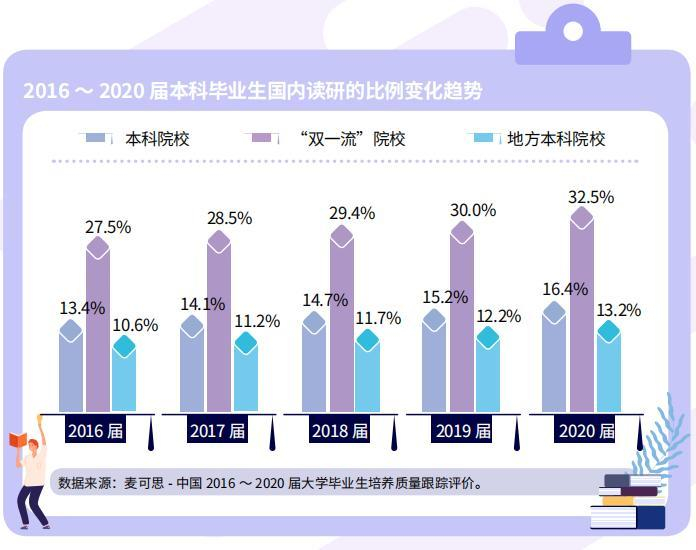 《2021年中国本科生就业报告》显示,全国本科毕业生国内读研比例由2016届的13.4%逐年增至2020届的16.4%,上升了3个百分点。