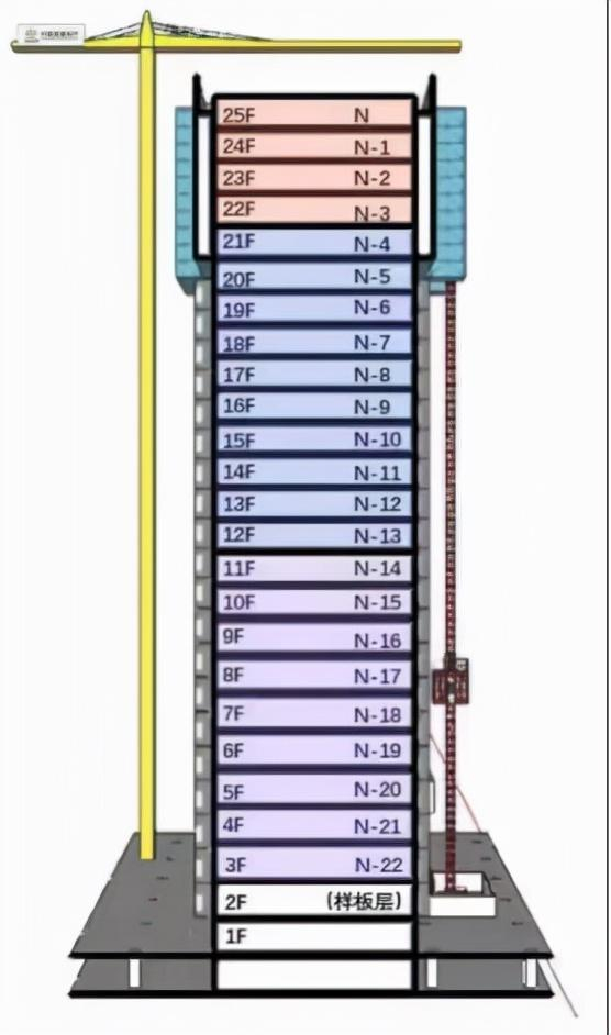 全穿插N-22+192天后主体模型,N至N-3为砼层,N-4至N-13为总包穿插层,N-14至N-22为精装湿作业穿插层