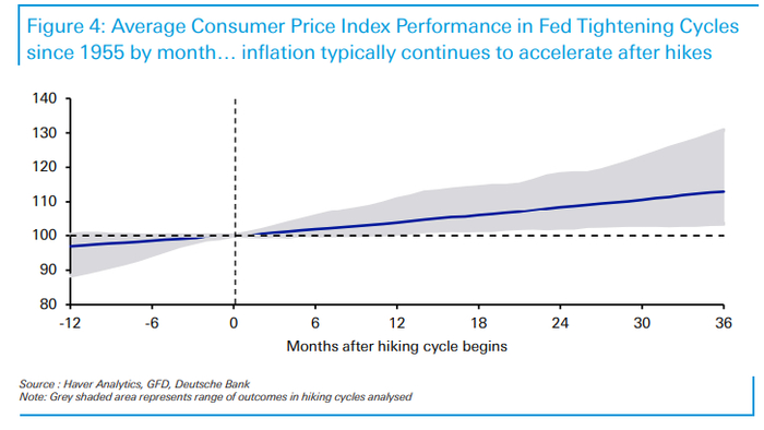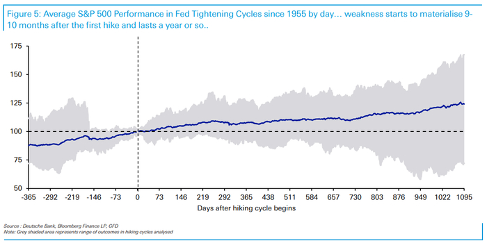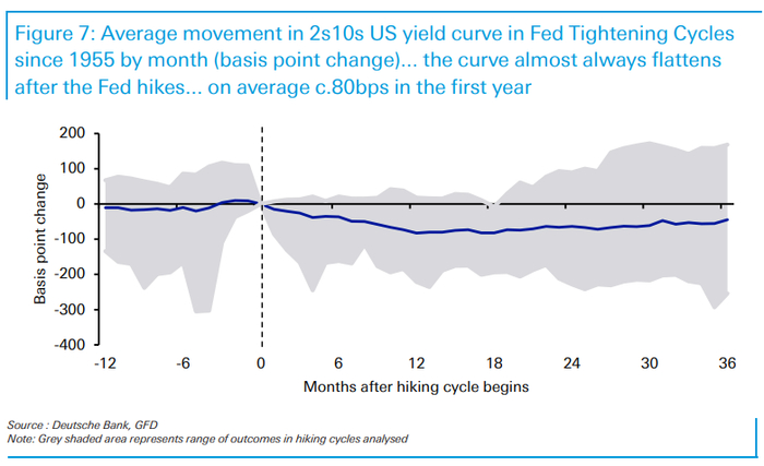 德意志银行研究部通过对过往历史上美联储加息后的市场变化进行回顾后发现,从首次加息算起,通常加息第一年经济增长保持强劲,通胀继续上升,股市继续上涨,信贷紧缩,债券收益率曲线趋平;到了第二年,经济增长开始放缓,股市趋于平稳,信贷开始扩大,债券收益率下降。