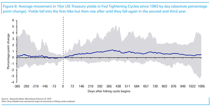 值得注意的是,在首次加息前的12个月里,收益率往往会下降,但在首次加息结束后又开始上升。
