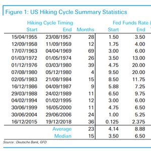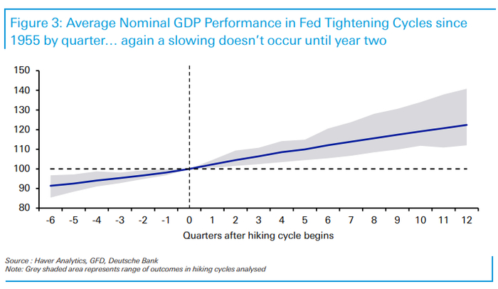 平均而言,在加息周期的第一年,实际GDP增长为+4.8%,但在第二年放缓至+2.7%,第三年为+2.1%。