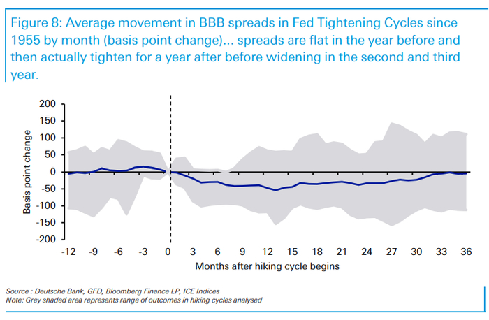 信贷方面,从历史上看,BBB信用利差在加息第一年会收窄,大约收窄47个基点。之后利差趋于扩大,在加息周期开始三年后几乎回到原本水平。在首次加息开始时,又会出现显著变化。