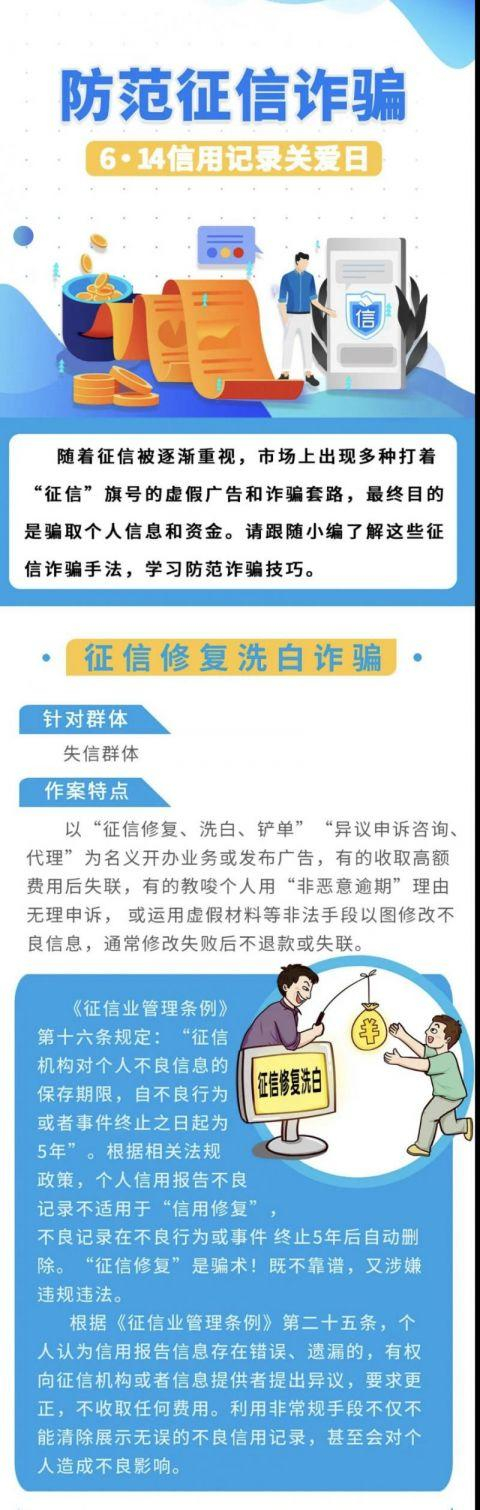 “逾期征信记录都可以修复,45天内保证修复好。洗白之后,你就可以重新申请贷款,当然要收些费用。”当你正因征信记录上有逾期信息发愁时,看到这样的广告,你会动心吗? 近年来,部分机构或个人利用消费者缺乏征信知识和法律常识的弱点,混淆征信异议、信用修复概念,以所谓“征信洗白”“征信修复”形成了一条集征信修复培训、加盟代理、个人信息售卖于一体的灰色产业链。央行有关人士提醒大家,无论是征信机构还是商业银行,都无权随意更改、删除信用报告中正确展示的信用信息;征信领域不存在“征信修复”这一说法;凡是进行征信信息“逾期铲单”、“洗白修复”的,都是诈骗。
