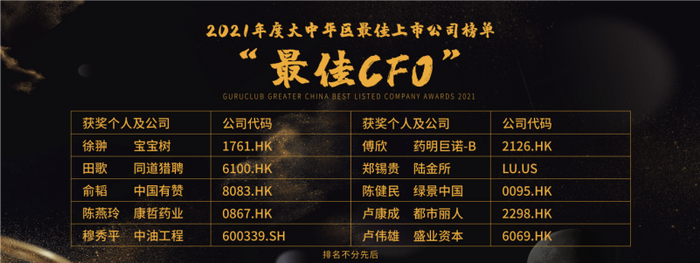 宝宝树(1761.HK)徐翀、同道猎聘(6100.HK)田歌、中国有赞(8083.HK)俞韬、康哲药业(0867.HK)陈燕玲、中油工程(600339.SH)穆秀平、药明巨诺-B (2126.HK)傅欣、陆金所(LU.US)郑锡贵、绿景中国(0095.HK)陈健民、都市丽人(2298.HK)卢康成、盛业资本(6069.HK)卢伟雄荣获“最佳CFO”殊荣。