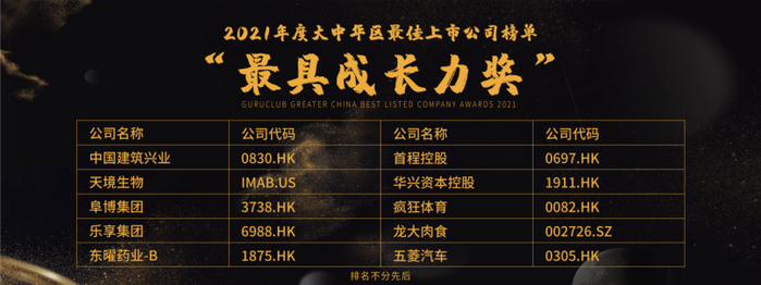 中国建筑兴业(0830.HK)、天境生物(IMAB.US)、阜博集团(3738.HK)、乐享集团(6988.HK)、东曜药业-B(1875.HK)、首程控股(0697.HK)、华兴资本控股(1911.HK)、疯狂体育(0082.HK)、龙大肉食(002726.SZ)、五菱汽车(0305.HK)荣获“最具成长奖”殊荣。