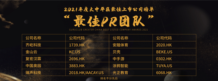 齐屹科技(1739.HK)、金山云(KC.US)、复宏汉霖(2696.HK)、中国奥园(3883.HK)、瑞声科技(2018.HK/AACAY.US)、安踏体育(2020.HK)、贝壳(BEKE.US)、中手游(0302.HK)、涂鸦智能(TUYA.US)、光正教育(6068.HK)荣获“最佳PR团队”殊荣。