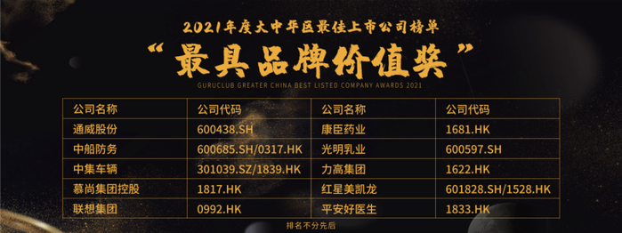通威股份(600438.SH)、中船防务(600685.SH/0317.HK)、中集车辆(301039.SZ/1839.HK)、慕尚集团控股(1817.HK)、联想集团(0992.HK)、康臣药业(1681.HK)、光明乳业(600597.SH)、力高集团(1622.HK)、红星美凯龙(601828.SH/1528.HK)、平安好医生(1833.HK)荣获“最具品牌价值奖”殊荣。