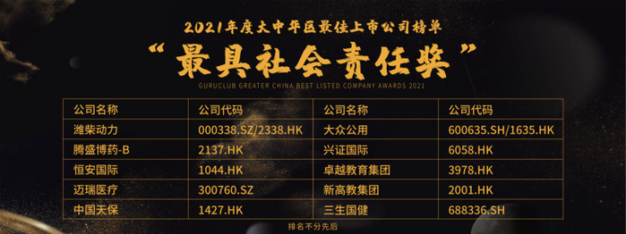 潍柴动力(000338.SZ/2338.HK)、腾盛博药-B(2137.HK)、恒安国际(1044.HK)、迈瑞医疗(300760.SZ)、中国天保(1427.HK)、大众公用(600635.SH/1635.HK)、兴证国际(6058.HK)、卓越教育集团(3978.HK)、新高教集团(2001.HK)、三生国健(688336.SH)荣获“最具社会责任奖”殊荣。