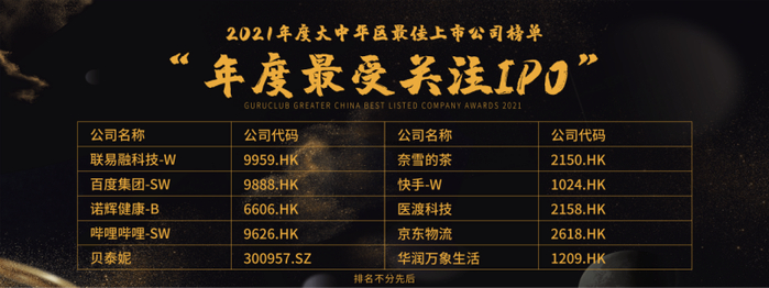 联易融科技-W(9959.HK)、百度集团-SW(9888.HK)、诺辉健康-B(6606.HK)、哔哩哔哩-SW(9626.HK)、贝泰妮(300957.SZ)、奈雪的茶(2150.HK)、快手-W(1024.HK)、医渡科技(2158.HK)、京东物流(2618.HK)、华润万象生活(1209.HK)荣获“年度最受关注IPO”殊荣。