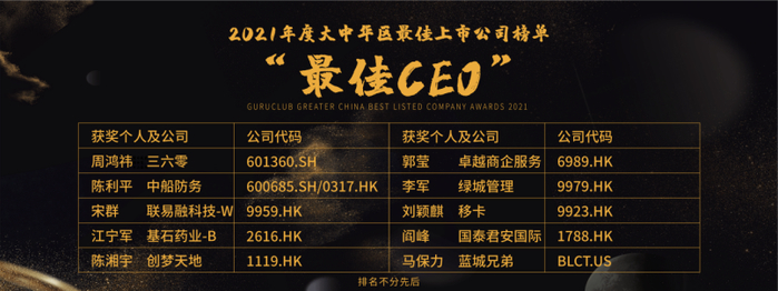三六零(601360.SH)周鸿祎、中船防务(600685.SH/0317.HK)陈利平、联易融科技-W(9959.HK)宋群、基石药业-B(2616.HK)江宁军、创梦天地(1119.HK)陈湘宇、卓越商企服务(6989.HK)郭莹、绿城管理(9979.HK)李军、移卡(9923.HK)刘颖麒、国泰君安国际(1788.HK)阎峰、蓝城兄弟(BLCT.US)马保力荣获“最佳CEO”殊荣。