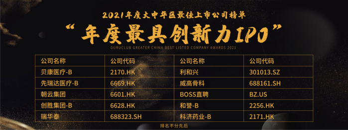 贝康医疗-B(2170.HK)、先瑞达医疗-B(6669.HK)、朝云集团(6601.HK)、创胜集团-B(6628.HK)、瑞华泰(688323.SH)、利和兴(301013.SZ)、威高骨科(688161.SH)、BOSS直聘(BZ.US)、和誉-B(2256.HK)、科济药业-B(2171.HK)荣获“年度最具创新力IPO”殊荣。