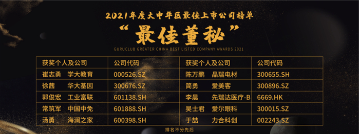 学大教育(000526.SZ)崔志勇、华大基因(300676.SZ)徐茜、工业富联(601138.SH)郭俊宏、中国中免(601888.SH)常筑军、海澜之家(600398.SH)汤勇、晶瑞电材(300655.SH)陈万鹏 、爱美客(300896.SZ)简勇、先瑞达医疗-B(6669.HK)李晨、爱尔眼科(300015.SZ)吴士君、力合科创(002243.SZ)于喆荣获“最佳董秘”殊荣。