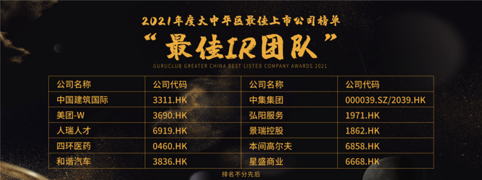 中国建筑国际(3311.HK)、美团-W(3690.HK)、人瑞人才(6919.HK)、四环医药(0460.HK)、和谐汽车(3836.HK)、中集集团(000039.SZ/2039.HK)、弘阳服务(1971.HK)、景瑞控股(1862.HK)、本间高尔夫(6858.HK)、星盛商业(6668.HK)荣获“最佳IR团队”殊荣。