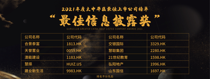 合景泰富(1813.HK)、天誉置业(0059.HK)、澳能建设(1183.HK)、慧择(HUIZ.US)、建业新生活(9983.HK)、交银国际(3329.HK)、慧聪集团(2280.HK)、21世纪教育(1598.HK)、弘阳地产(1996.HK)、山东国信(1697.HK)荣获“最佳信息披露奖”殊荣。
