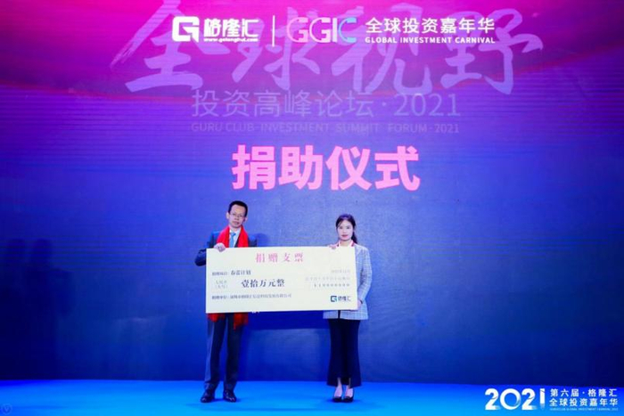 随后,会上格隆汇创始人格隆博士进行了对中国儿童少年基金会的“春蕾计划”公益项目的捐助仪式。因疫情防控等原因,中国儿童少年基金会代表无法亲自来到现场,通过视频与参会者进行了问候。