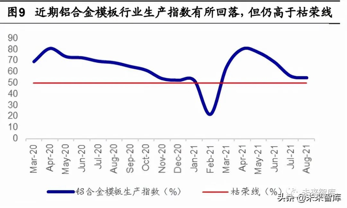 铝价大幅攀升影响行业短期扩张速度。受疫情影响,2020 年 3-4 月,吨铝锭价格最 低跌至 1.2 万元以下,随后铝锭价格持续震荡上行,2020 年年底稍有回落,但接着从 2021 年起铝锭价格继续飙升,截至 2021 年 9 月吨铝价已经超过 2.2 万元大关,价格区 间处于历史高位。在此原材料价格影响下,根据中国模板脚手架协会数据,2021 年铝模 板销售价格显著上涨,市场均价(不含税)由 2020 年的 850-900 元之间跃升至 2021 年的 1000 元及以上。我们认为,铝价格高企一方面,抑制了新增产能的进入;另一方 面,也抑制了原有企业产能的扩张。行业生产指数对此也有所体现,2021 年 8 月铝合金 模板行业生产指数为 54.4%,连续四个月下滑,但降幅收窄,且仍高于荣枯线 4.4 个百 分点,这说明铝模板行业生产仍处于扩张态势,但步伐有所放缓。