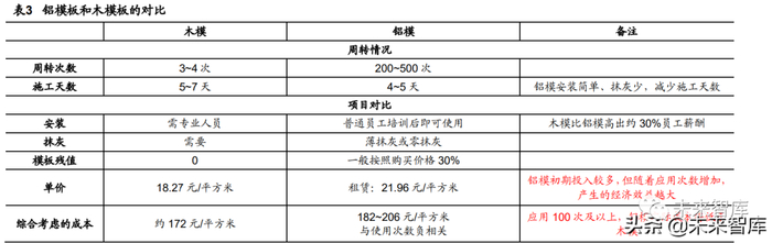 铝模板相比于木模板具有高周转,施工快,安装方便,抹灰少等优势,属于国家近 年来大力推广提倡应用的绿色建材,随着建筑规模的增大,当铝模板重复使用次数超过 100 次时,铝模板均摊成本甚至会低于木模板;且近年来铝模板企业随着实力的提高开 始提供铝模板租赁服务,这也使得铝模板使用的资金投入成本显著减少,进而增强了铝 模板的市场竞争力。
