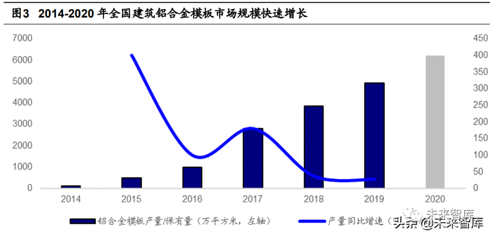 我国铝合金模板市场规模快速增长,2020 年全国建筑铝合金模板市场规模约为 364 亿元。2014-2019 年全国建筑铝合金模板产量由 100 万 m 2 快速增长到 4920 万 m 2。截 至 2020 年,全国建筑铝合金模板市场保有量 6200 万 m 2,铝合金模板生产销售、租赁 承包收入约为 364 亿元。
