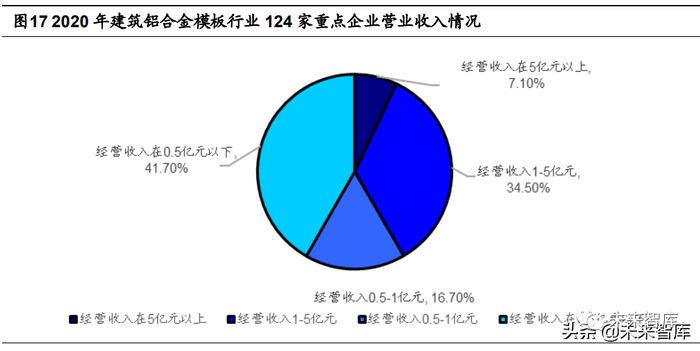 我国铝合金模板大部分企业生产规模较小,行业集中度不高,形成了“大行业,小 公司”的行业特征。我国大多数铝合金模板企业规模较小,根据中国有色金属工业协会网 援引中国模板脚手架协会统计,截至 2020 年 8 月,全国规模以上建筑铝合金模板研发 设计、生产加工、租赁承包企业 800 余家,其中特大型企业仅有 2 家,大型铝模企业约 15 家(100 万平方米以上),中型铝模企业约 50 家,小型铝模企业 100 多家,同时分 布有一批微型企业。同时根据 2020 年中国基建物资租赁承包协会对业内 124 家重点企 业基本情况进行的统计分析结果,铝合金模板企业经营总收入在 5 亿元以上仅占比 7.1%,1-5 亿元占比 34.5%,0.5 亿-1 亿元占比 16.7%,0.5 亿元以下占比 41.7%,可 以发现行业整体市场份额较为分散,也说明竞争比较充分。