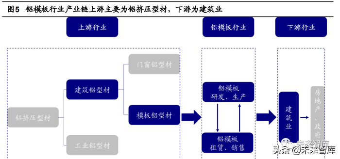从产业链来看,建筑铝模系统的主要原材料为铝型材及少量铁配件,其直接相关上 游行业为铝挤压型材中的建筑模板铝型材,而铝模系统是应用于建筑施工中混凝土浇筑 成形的临时支护结构体系,因此其直接相关下游行业为建筑业。