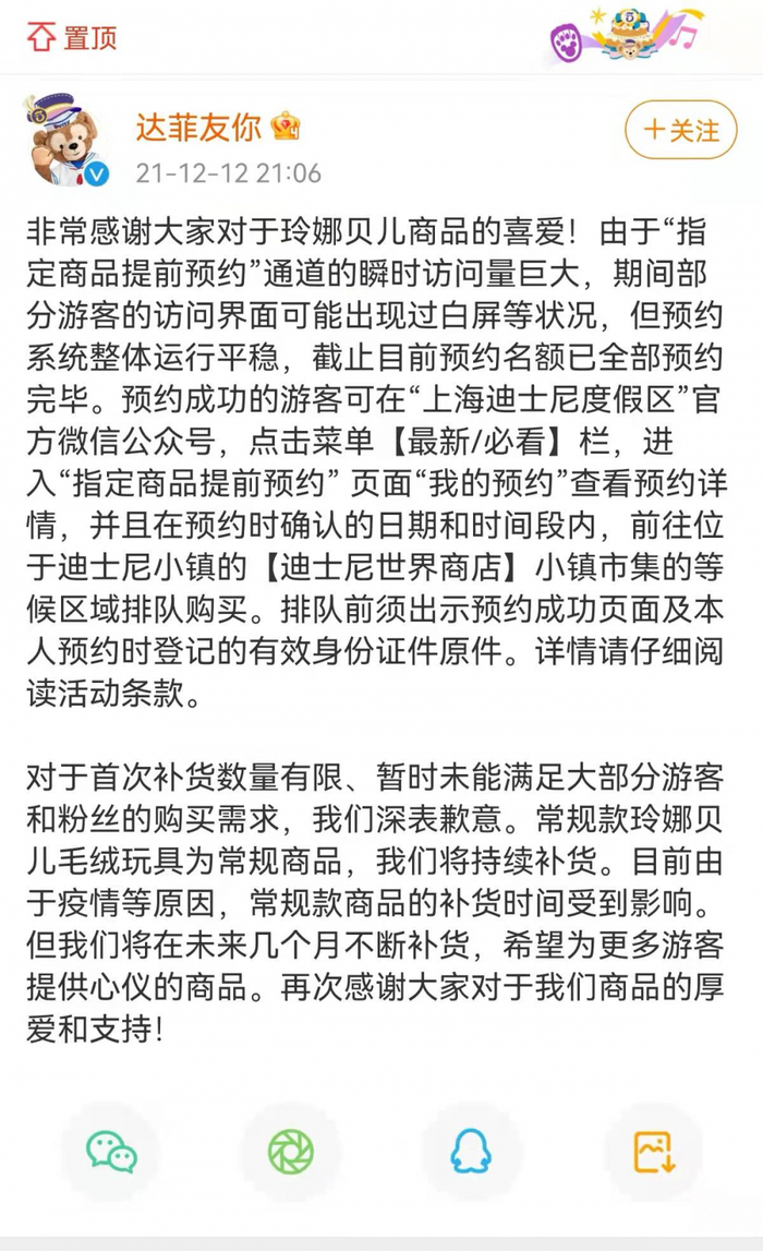 达菲友你官方微博12日晚21:06分发布消息回复称,由于“指定商品提前预约”通道的瞬时访问量巨大,期间部分游客的访问界面可能出现过白屏等状况,但预约系统整体运行平稳,截止目前预约名额已全部预约完毕。