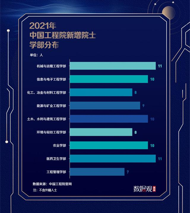 中国工程院各学部中,信息与电子工程部院士人数最多,共140位院士。紧随其后的是机械与运载工程学部,有139位院士。在2021年增选的中国工程院院士中,医药卫生部、机械与运载工程学部的增选院士人数最多,均达到11人。其次是农业学部、信息与电子工程学部和土木、水利与建筑工程学部,分别增选10位院士。其中,医药卫生部增选的院士人数在2019年有大幅提升后,今年继续保持增加趋势。