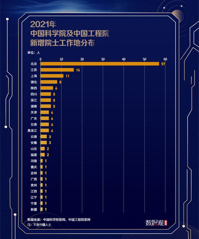 从新增院士工作单位所在地来看,北京、江苏、上海三省市连续多年蝉联院士增选数量前三,北京、江苏和上海今年分别有57人、16人、11人当选,占到了总数的56.4%。