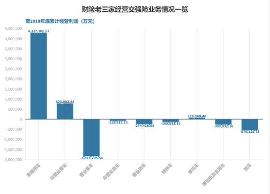 记者梳理人保财险、平安财险和太保产险经营交强险业务的数据发现,2006年至2019年末,“老三家”家庭用车、非营业客车、摩托车交强险均实现盈利,其中家庭用车经营利润为433.71亿元,远超非营业客车和摩托车。而营业客车和营业货车交强险累计经营利润都为负,营业客车亏损为各车辆类别中最多,累计亏损187.32亿元。