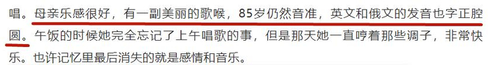 张安中热爱唱歌,80多岁还有一把好嗓子,只要有力气便会唱,尤其喜欢唱苏联和美国的老歌。有人夸她唱得好时,她会脸红,会腼腆,露出少女一般的娇羞。