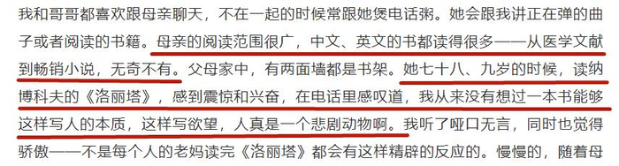 她依旧喜欢读书,快80岁的时候,读到纳博科夫的《洛丽塔》,一样感到震惊和兴奋,和女儿感慨,“我从来没有想过一本书能够这样写人的本质,这样写欲望,人真是一个悲剧动物啊。”