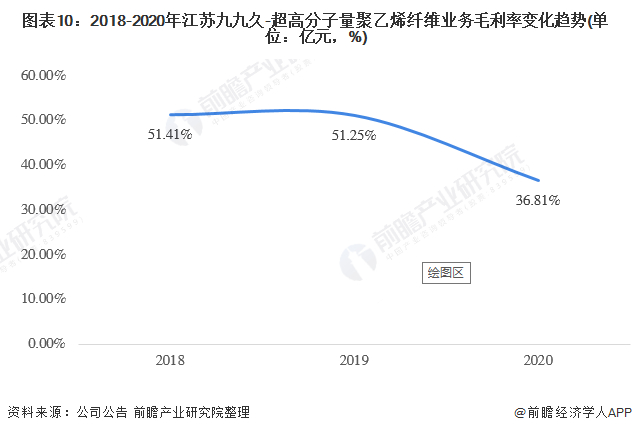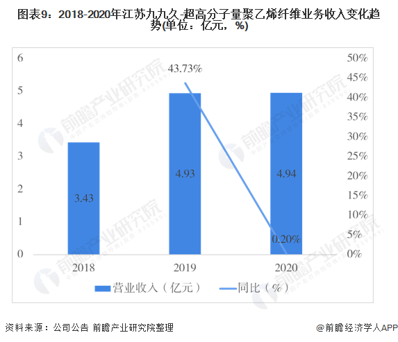 从超高分子量聚乙烯纤维业务的经营情况来看,2018-2020年,江苏九九久的超高分子量聚乙烯纤维业务收入稳步增长,2019年超高分子量聚乙烯纤维业务营业收入为4.93亿元,同比增长43.73%,2020年公司超高分子量聚乙烯纤维业务营业收入为4.94亿元,同比增长0.2%。