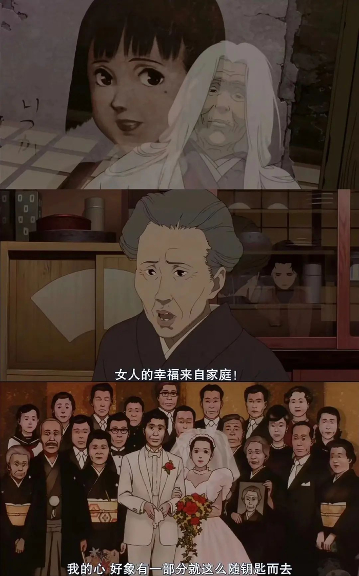当然,影片也表达了诸多社会意识的反思:今敏塑造了一个年迈的千代子的心魔的形象,这心魔应是社会对女性期待的集体无意识的表达,在影片中的每个女性身上都有所映射:母亲告诫千代子女人的幸福来自家庭;千代子的钥匙也在大泷导演的策划下被不再年轻的演员岛尾泳子所偷走,她的追逐之路也因而渐渐停滞,最终成为了大泷的妻子,从此便觉得人生好像失去了些什么。社会对女性的规训与要求,无疑成为了千代子追逐道路上的障碍。