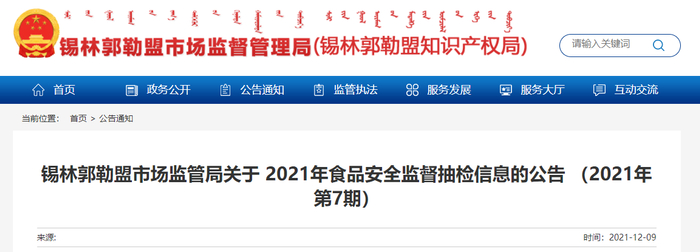 中国质量新闻网讯 近日,内蒙古锡林郭勒盟市场监督管理局发布关于2021年食品安全监督抽检信息的公告(2021年第7期)。