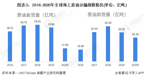 2015-2020年,全球海上原油运输量先上升后下降。2018年运输量为近几年最高值。上升的主要原因是2018年原油供需两端担忧的重燃、且美国对伊朗制裁予以多国豁免、全球资本市场大跌拖累油价等,致使需求大幅上涨。2019年之后原油价格趋于平稳,运输量回归常态。2020年以来受到原油供需受到疫情重挫,经过初步估算,装卸货量均出现下滑态势,分别为17.00亿吨和20.20亿吨。
