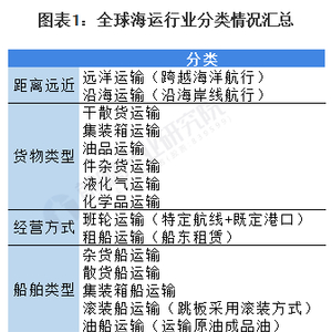 海洋运输又称“国际海洋运输”,是提供海上客运或者货运服务的行业,是国际物流中最主要的运输方式。海运可以根据距离远近、经营方式、船舶类型和货物类型分成四大类。其中较为常见的分类方式为货物类型分类,干散货运输、集装箱运输和油品运输是三大运输板块,报告后文将根据货物类型展开分析。
