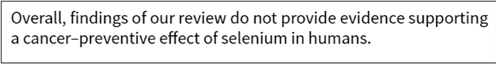 得出的结论是什么呢?就是下面这段话。我给大家翻译一下:“总体而言,我们没有发现证据支持补硒可以预防人类癌症。”