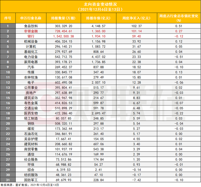 近6个交易日内,北向资金对非银金融板块的加仓明显,累计净买入101.4亿元,持股数量为72.85亿股,持股市值1365亿元。其中12月13日,非银金融板块获北向资金净买入26.3亿元,为当日所有板块中最多。
