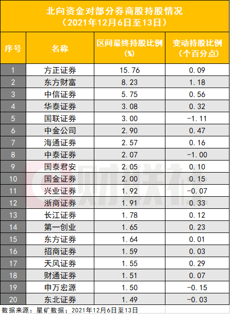 据星矿数据统计,截至12月13日的近6个交易日内,超七成的券商股获北向资金净买入,尤其是东方财富,获北向资金增持1.22亿股,环比增长16.73%;净买入67.39亿元,环比增长26.12%。