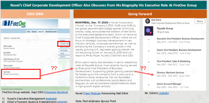 2020年12月,Neil Erlick被任命为Nuvei公司的首席发展官。在他的履历中,他在Paysafe集团担任了近20年的高管职务。然而,履历中隐藏了他还在FireOne Group工作过的事实。
