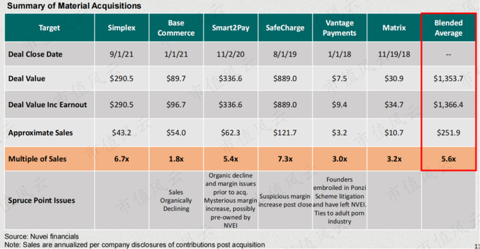 SP统计,Nuvei高达40%的收入是来自收购的子公司,平均收购的估值约为营收的5.6倍。SP认为收购过程有许多问题。