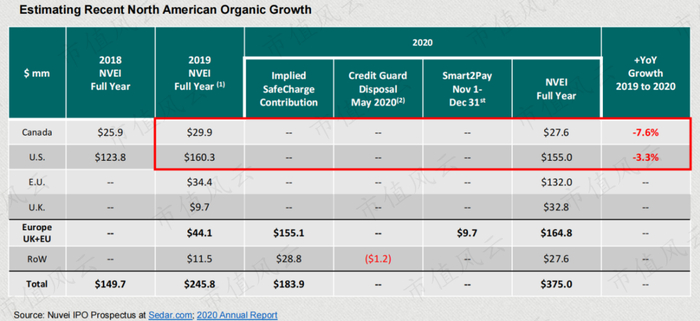根据公司2020年年报,假设收购的Safecharge贡献了全部外国收入,则美国和加拿大的收入分别下降了-3.3%和-7.6%。Nuvei的增长依赖收购,而非内生增长。