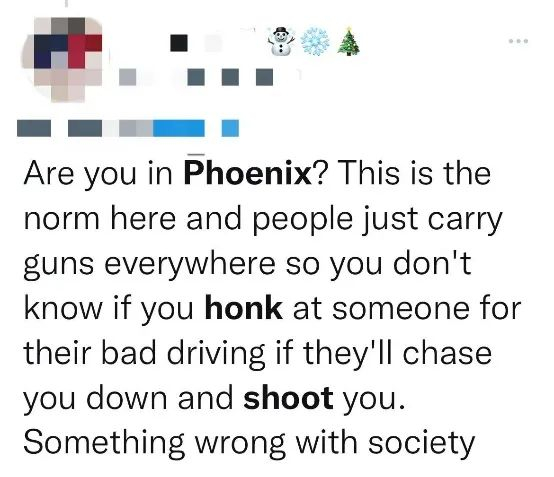 一名网友写道:“你在菲尼克斯市吗?这里的常态是人们到处都带着枪。所以你永远不知道,要是有人开车不规矩而你按了喇叭,对方会不会追上来朝你开枪。我们的社会出了问题。”