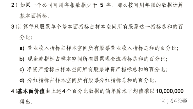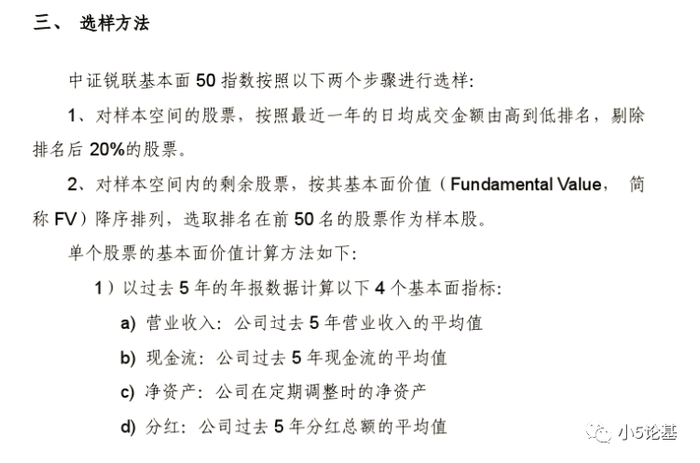 简单来说就是,这个指数以过去5年平均营业收入、过去5年平均现金流、过去5年平均分红和现在的净资产四个因素的百分比数据的平均值,计算出一家公司的所谓“基本面价值”,然后再以这个基本面价值为排名依据,选出沪深两市中经济规模最大(基本面价值最大)的50只股票。