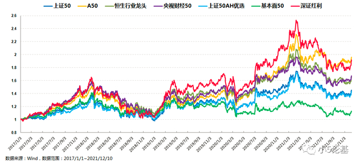 为了能直接做对比,所以我选了这些指数的交集——2017年至今这个接近5年的时段。这个时段虽然算不上长,但也至少经历了一轮牛熊,以及各种不同风格类型的市场,算是具有一定的代表性。