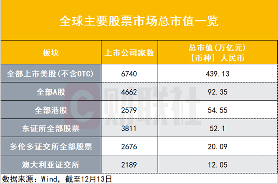 全球对比来看,美国股市市值排名第一,Wind数据显示,截至12月13日,全部美股上市公司总市值达到439.13万亿元,港股总市值为54.55万亿元,日本上市公司总市值达52.10万亿元,加拿大多伦多证交所总市值为20.09万亿元,澳大利亚证交所总市值为12.05万亿元。