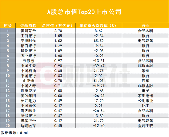 与此同时,随着我国产业结构不断优化升级,A股总市值Top20上市公司中,除了金融、石化、采掘等传统企业外,以宁德时代、隆基股份等为代表的新能源、高端制造企业也占据了重要的一席之地;以从今年股价涨跌幅来看,宁德时代(85.5%)、比亚迪(51.08%)和隆基股份(31.70%)稳居前三,长江电力(17.20%)、海康威视(12.68%)同样涨幅居前。