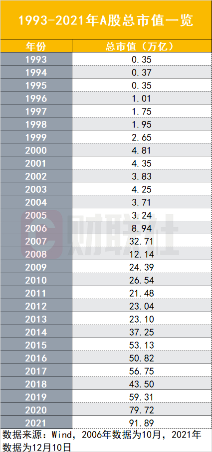 2006年12月14日,上证综合指数创下设立16年以来的新高2250.32点,这一年年底A股总市值突破10万亿大关。