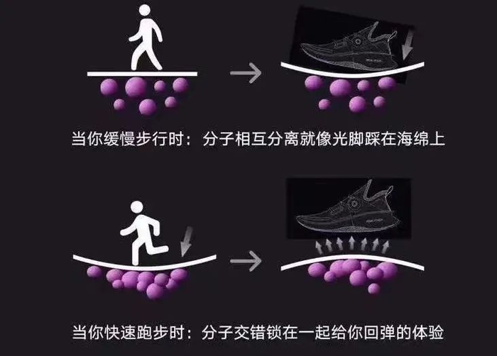 在低速运动状态下,态极科技可以为穿着者提供柔软舒适的穿着体验。当穿着者的运动速度加快,中底则会随着形变而改变,弹性随之增大,为穿着者提供运动所需要的回弹和支撑性。走路时则会提供舒适的柔软感,跑步时提供良好的回弹效果,同时具有“缓震”和“回弹”这两个原本无法在一个鞋子科技上兼容的属性。