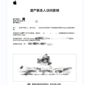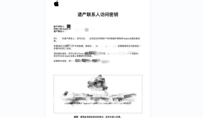 添加遗产联系人完成后,系统会提示打印纸质密钥文件。用户去世后,遗产联系人需向苹果提供密钥和死亡证明才可查阅数字遗产,不过,遗产联系人可查阅的信息仅限于苹果生态应用,如iCloud内的照片、备忘录和Safari的书签等,而非无限制的查看账号里的所以内容。